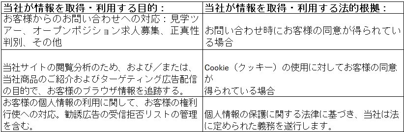 – 見学ツアーお申し込み(お問い合わせフォームあるいは見学お申し込みフォーム):見学訪問者に対して適切なサポートサービスを提供する目的で、情報取得日あるいはお客様からの最後の連絡日から3年間の期限で保存します。 ;